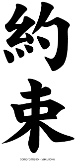 Na imagem ilustrativa temos o símbolo no idioma japonês, escrito em Kanji, o qual lemos “yakusoku” e significa Compromisso.